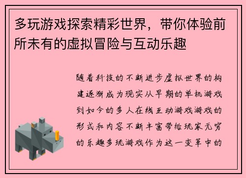 随着科技的不断进步,虚拟世界的构建逐渐成为现实。从早期的单机游戏到如今的多人在线互动游戏,游戏的形式和内容不断丰富,带给玩家无穷的乐趣。多玩游戏作为这一变革中的佼佼者,通过其创新的玩法与丰富的内容,带...